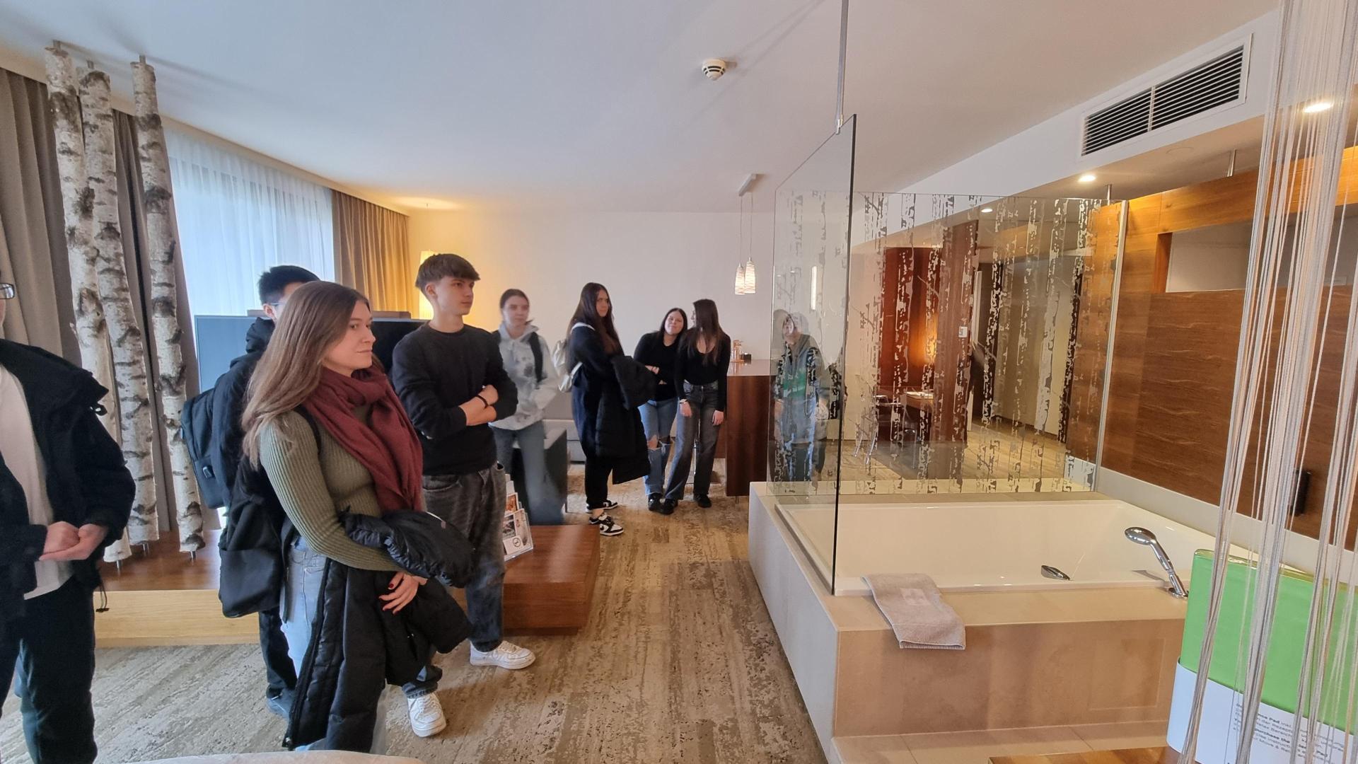 Die Schüler*innen besichtigten die großzügigen Tagungsräume, das stilvolle Restaurant sowie den beeindruckenden Relax- und Bewegungsbereich des Hauses. Auch Zimmer aus unterschiedlichen Kategorien wurden vorgestellt – vom komfortablen Standardzimmer bis hin zur exklusiven Mastersuite mit rund 100 Quadratmetern und luxuriöser Ausstattung. „Die Mastersuite war wirklich beeindruckend – so viel Platz und Eleganz erlebt man nicht alle Tage“, zeigten sich die Schüler*innen Melisa Čaušević und Mina Haderlap begeistert.