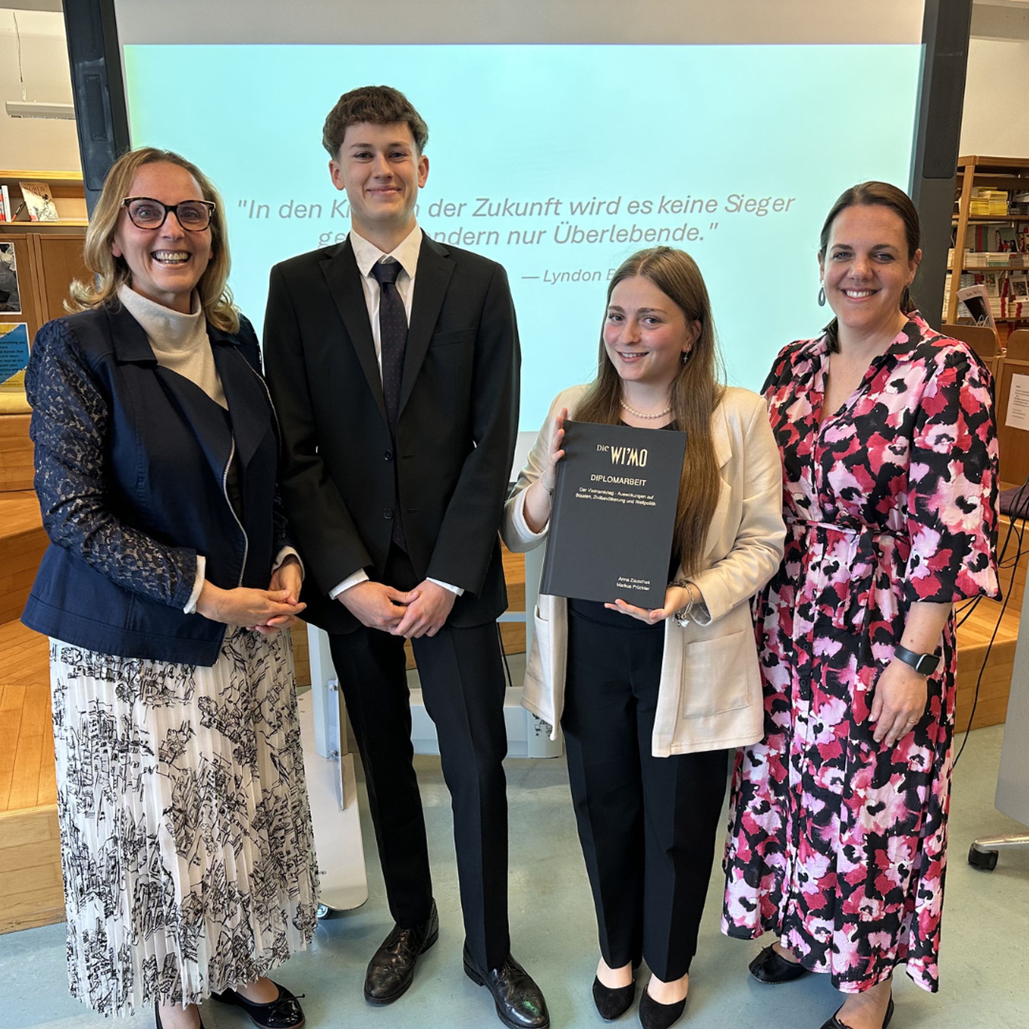 Für die angehenden Absolvent*innen der WI’MO hat die heiße Phase endgültig begonnen: Nicht nur der Notenschluss naht, in der abgelaufenen Woche präsentierten 85 Kandidat*innen ihre Diplomarbeiten vor der Prüfungskommission. Dabei waren nicht nur die Forschungsergebnisse zu selbstgewählten Hypothesen vorzustellen, sondern die eigene Expertise in der Diskussion unter Beweis zu stellen. Mit dabei waren auch die zurecht stolzen Klassenvorständ*innen Pia Kavelar, Isabella Kerth, Birgit Leitsberger und Bernhard Obiltschnig sowie die Fachvorständinnen Heidi Cas-Brunner und Lisa Reichmann.